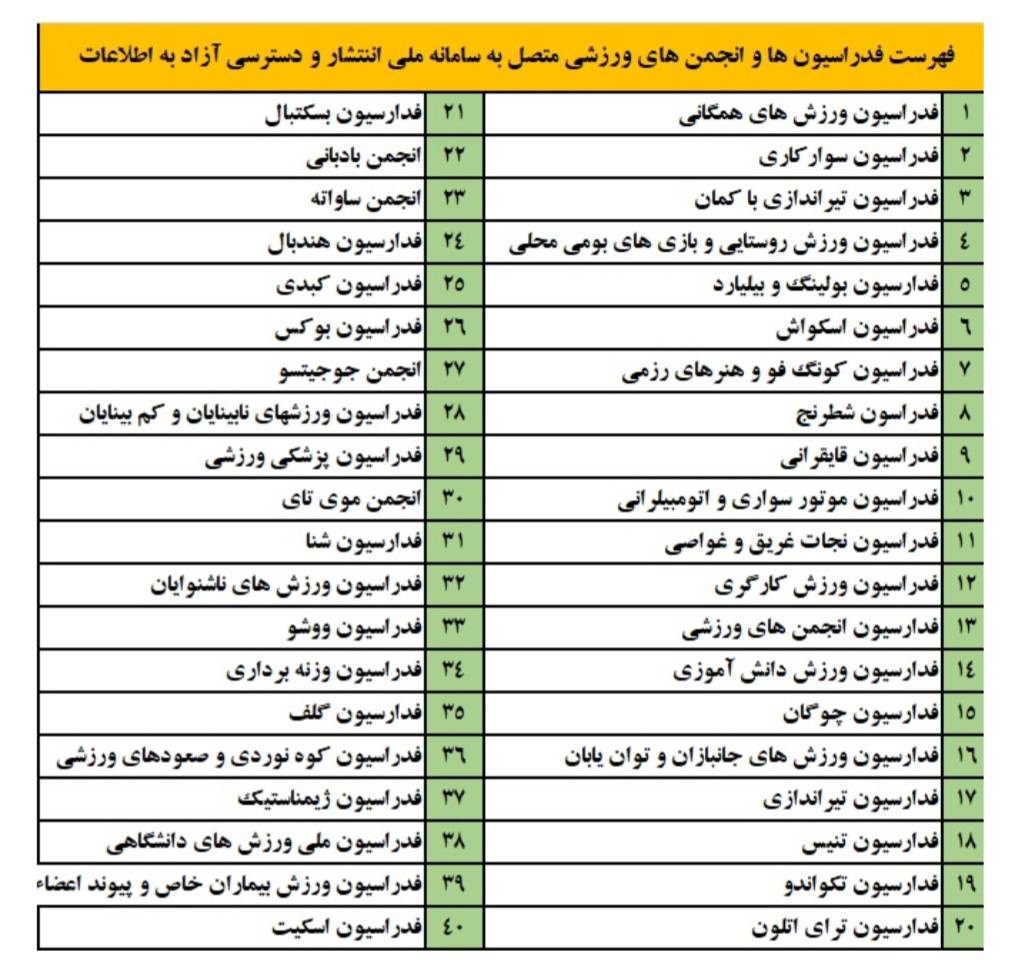 اکنون از مجموع52 فدراسیون ورزشی 40 فدراسیون به سامانه انتشار و دسترسی آزاد به اطلاعات پیوسته اند و مردم می توانند درخواست های اطلاعات خود را از این موسسات ثبت نمایند. فدراسیون ها و انجمن های ورزشی موسسات عمومی غیر دولتی محسوب می شوند و طبق مقررات در زمره مشمولین قانون هستند و مکلفند علاوه بر انتشار اطلاعات خود به صورت عمومی به درخواست های مردم برای دسترسی به اطلاعات پاسخ بدهند.