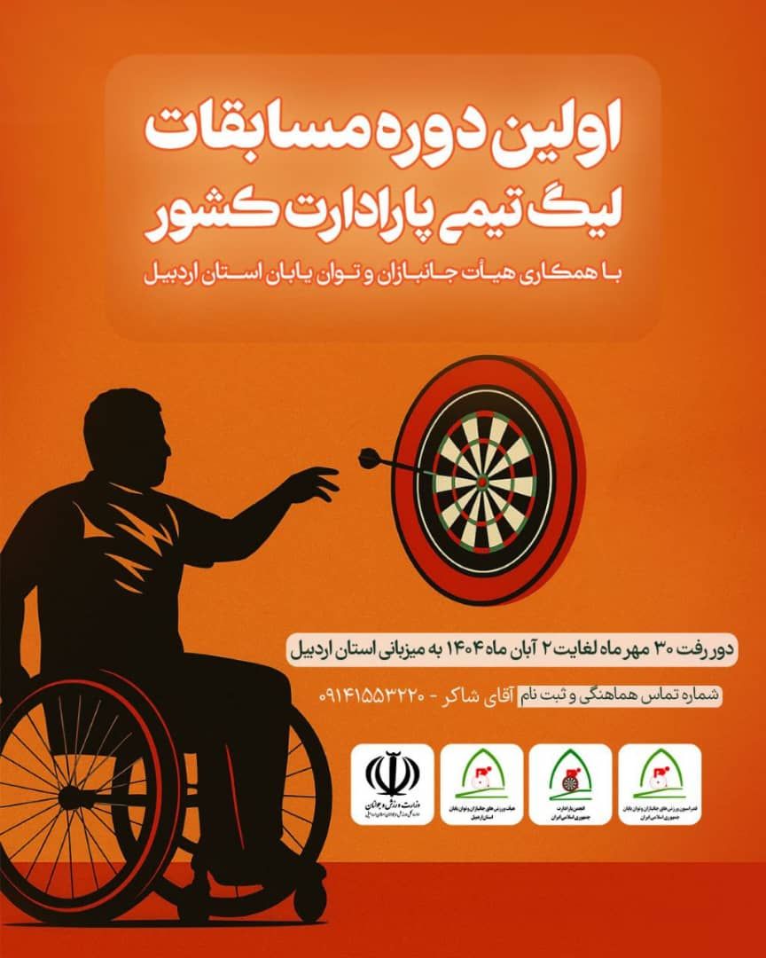 به گزارش روابط عمومی فدراسیون ورزشهای جانبازان و توان یابان، انجمن پارادارت اولین دوره لیگ تیمی این رشته در بخش آقایان را با همکاری و به میزبانی هیئت استان اردبیل از تاریخ ۳۰ مهر لغایت ۲ آبان ماه برگزار می کند.
