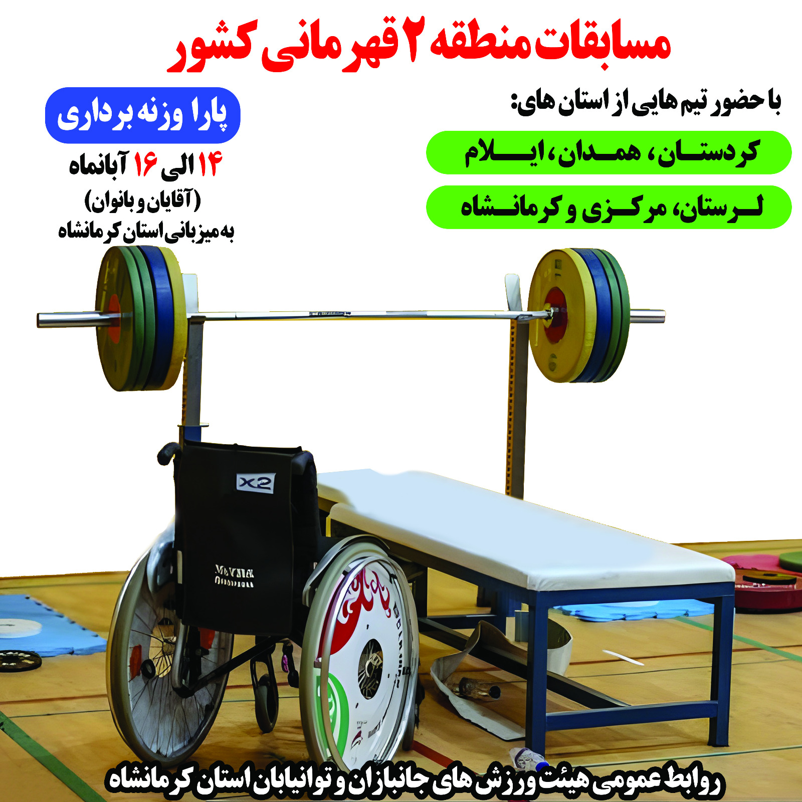 به گزارش روابط عمومی فدراسیون ورزش های جانبازان و توان یابان، مسابقات قهرمانی کشور پاراوزنهبرداری (آقایان و بانوان) منطقه یک در رده سنی جوانان و بزرگسالان، از چهاردهم تا شانزدهم آبان ماه به میزبانی استان کرمانشاه و با حضور تیم هایی از استان های کردستان، ایلام، لرستان، همدان، کرمانشاه و مرکزی برگزار می شود.
