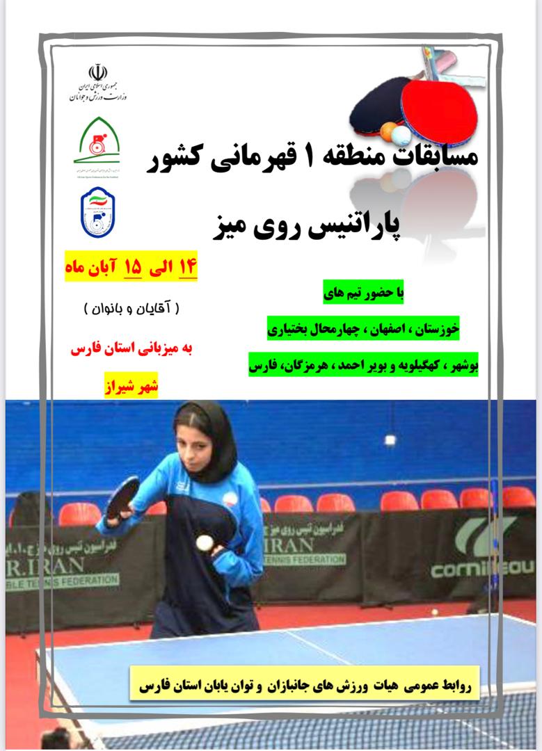 به گزارش روابط عمومی فدراسیون ورزش های جانبازان و توان یابان، مسابقات قهرمانی کشور منطقه یک پاراتنیس رویمیز (آقایان و بانوان) در رده سنی جوانان و بزرگسالان، به میزبانی استان فارس با حضور تیم هایی از استان های خوزستان، اصفهان، چهارمحال و بختیاری، بوشهر، کهگیلویه و بویراحمد و فارس از 14 تا 16 آبان ماه برگزار می شود.