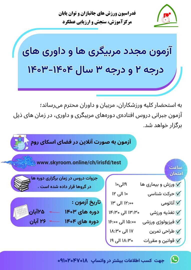 به اطلاع کلیه شرکتکنندگان دورههای مربیگری و داوری فدراسیون ورزشهای جانبازان و توانیابان در سالهای ۱۴۰۳ و ۱۴۰۴ میرساند: